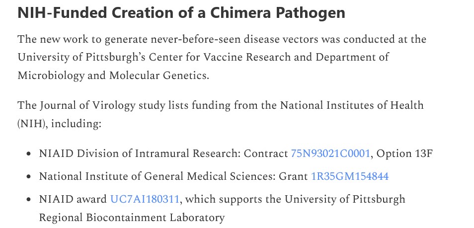 Yours Truly is aware that all the above may appear as a “long tale to tell.” However, the point is to “trace” how Dr. Baric used one particular NIH grant, AI 23946 (among many other NIH grants, to be sure) to help fund his research journey. Part One and Part Two discuss his experimenting with a mosquito-borne virus — to experiments with mouse hepatitis and mouse coronavirus proteins — to experiments with rabbit coronavirus proteins — to experiments of the recombination of mouse hepatitis and mouse coronavirus proteins — to experiments with inducing myocarditis and Congestive Heart Failure in rabbits injected with rabbit coronaviruses: experiments that, with the exception of the ones on the Sindbis virus, were funded, at least in part, by AI 23946.