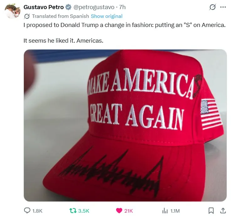 Petro called himself “optimistic and positive,” reporting discussions on “concrete problems and joint pathways,” and left with a modified MAGA hat reading “Make Americas Great Again.”