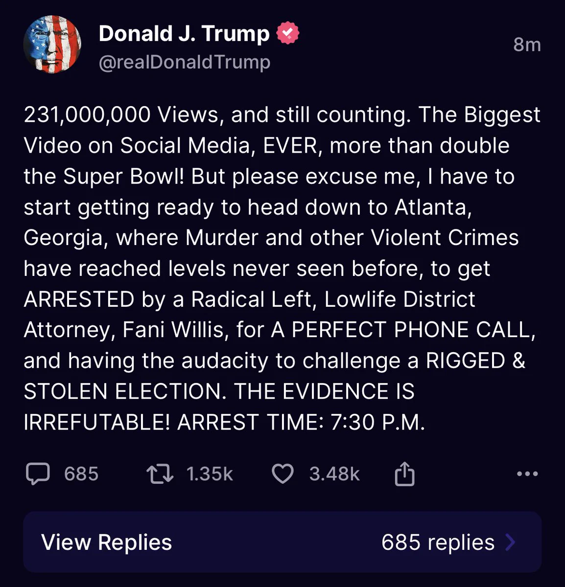 PDJT presents a strong countenance to the world, but these indictments have to be weighing heavily on him. I can’t imagine what it’s like to have to turn yourself in to thugs when you have done nothing wrong and were only trying to save your country. He needs all the prayers and support we can give.