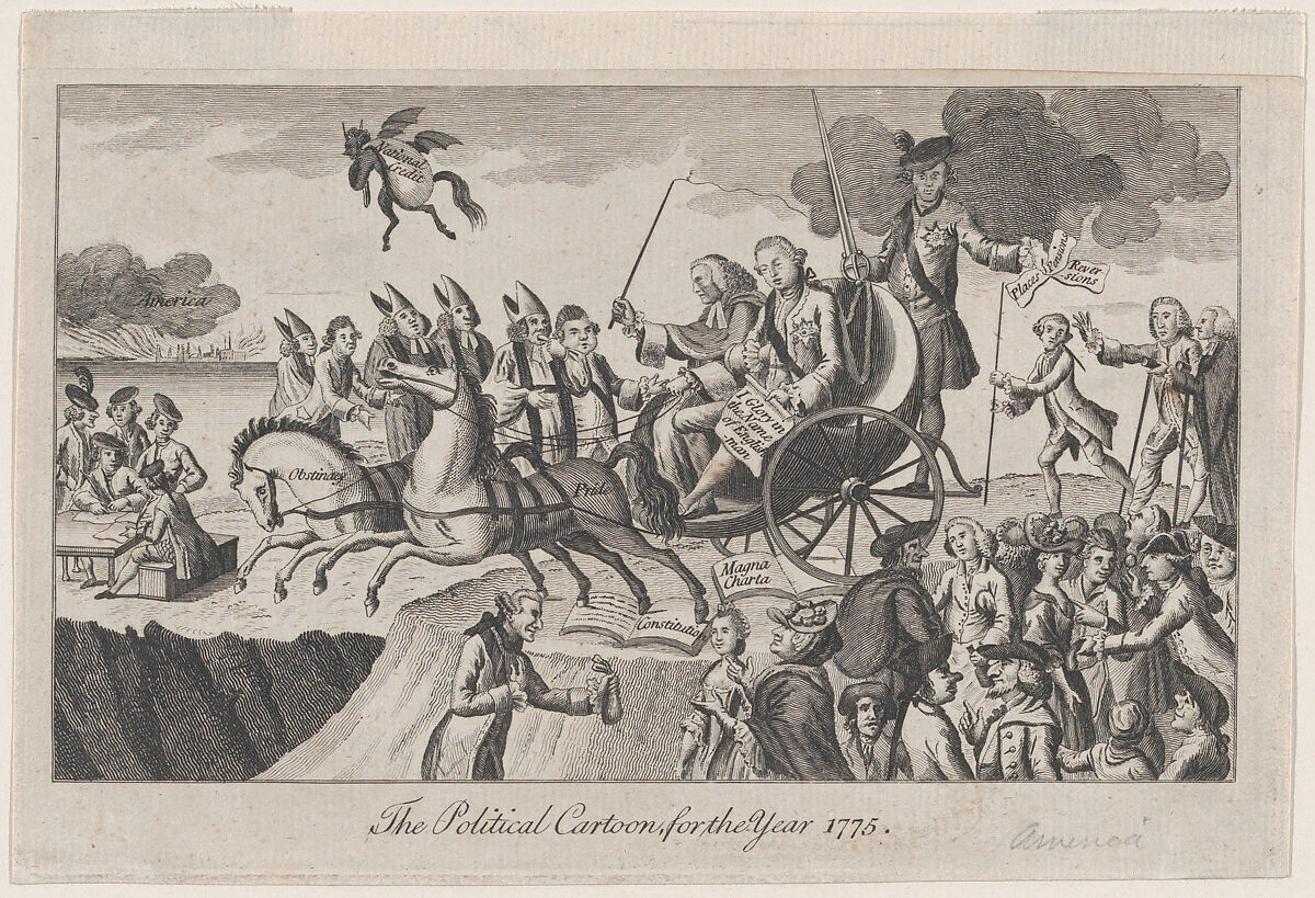 George III and Lord Mansfield, seated on an open chaise drawn by two horses labeled “Obstinacy” and “Pride,” about to lead Britain into an abyss represented by the war with the American colonies: