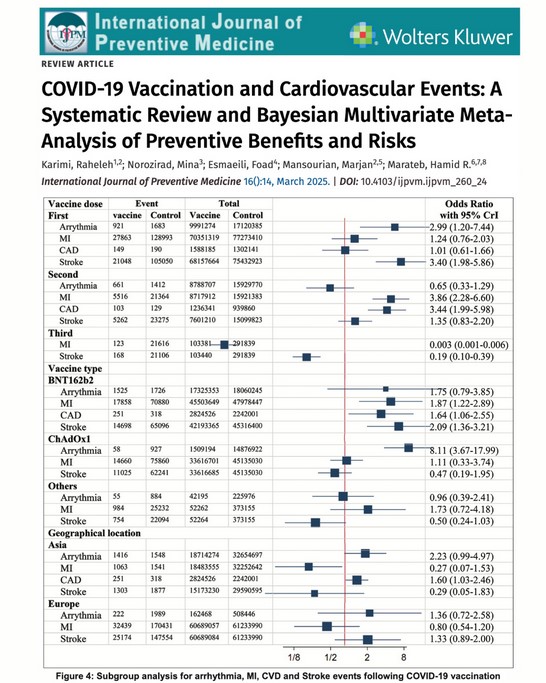 One begins here: https://www.thefocalpoints.com/p/breaking-85-million-person-study, “BREAKING: 85-Million-Person Study Finds Increased Risks of Stroke, Heart Attack, Coronary Artery Disease, and Arrhythmia Following COVID-19 Vaccination”, by Nicolas Hulscher, MPH, 7 April 2025. The new paper cited in his article is found here: https://doi.org/10.4103/ijpvm.ijpvm_260_24, “COVID-19 Vaccination and Cardiovascular Events: A Systematic Review and Bayesian Multivariate Meta-Analysis of Preventive Benefits and Risks”, Raheleh Karimi, et al., 14 March 2025. (A discussion on how Bayesian Multivariate Meta-Analysis models work is here: https://bookdown.org/MathiasHarrer/Doing_Meta_Analysis_in_R/bayesian-ma.html.) Two screenshots from the Hulscher article follow: One is from the paper; the other is his statistical analysis: