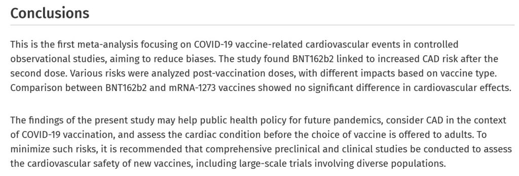 The following is the Conclusions section of the Karimi, et al., paper. It is astonishing to read that the authors appear to believe that the COVID-19 “vaccines” are “safe and effective” — just that persons with known (or suspected) cardiovascular issues should be tested before they are offered the opportunity to take one of these “vaccines”: