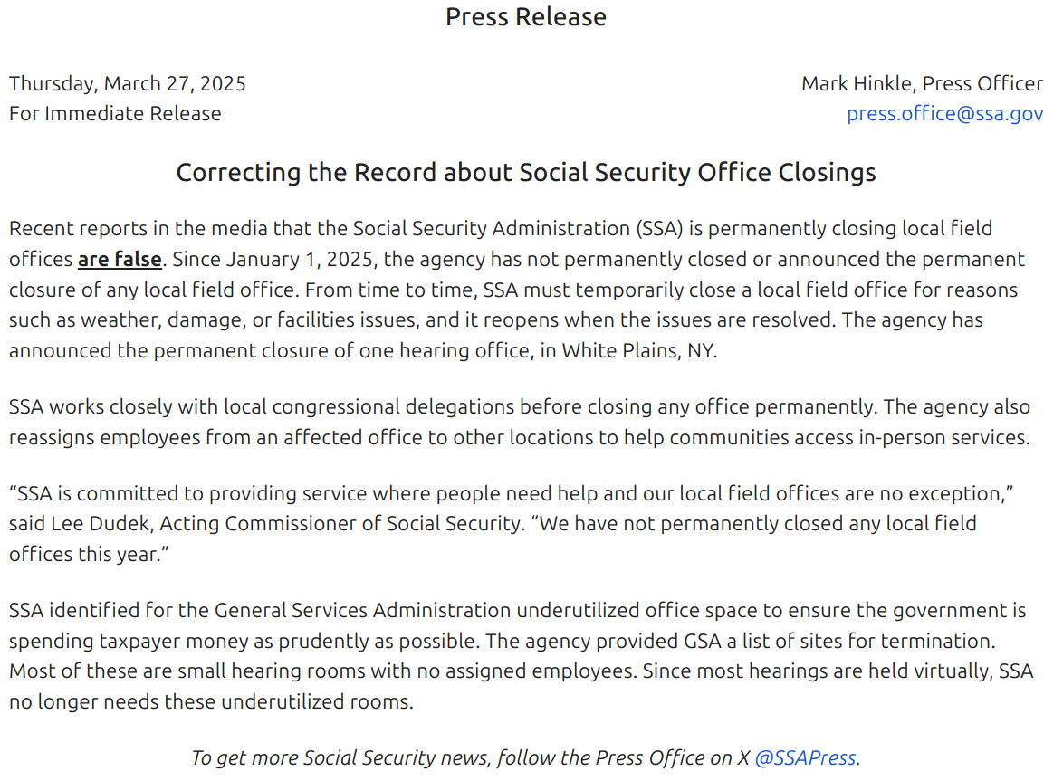 For more “correcting the record statements” they are on their blog. You can see them trying to counteract the opposition’s lies that are spun daily: https://blog.ssa.gov/