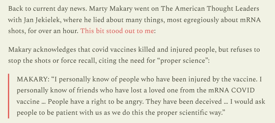 The Latypova 28 July article discusses several aspects of what appears to Yours Truly to be two things: first, an internecine war going on within the FDA; and, second, deep and potentially catastrophic conflicts of interest within certain key employees of the FDA regarding their personal prejudices versus the line of their duties within the FDA. The transcript portion above is from an interview with Dr. Martin Makary (current FDA Commissioner) by Jan Jekielek of American Thought Leaders (ATL) of 16 July 2025; the second screenshot is Ms. Latypova’s considered opinion as to what is going on “behind the scenes.” The Jekielek tweet about this interview, with an embed of the interview itself, is here: https://x.com/JanJekielek/status/1945560472909906288.
