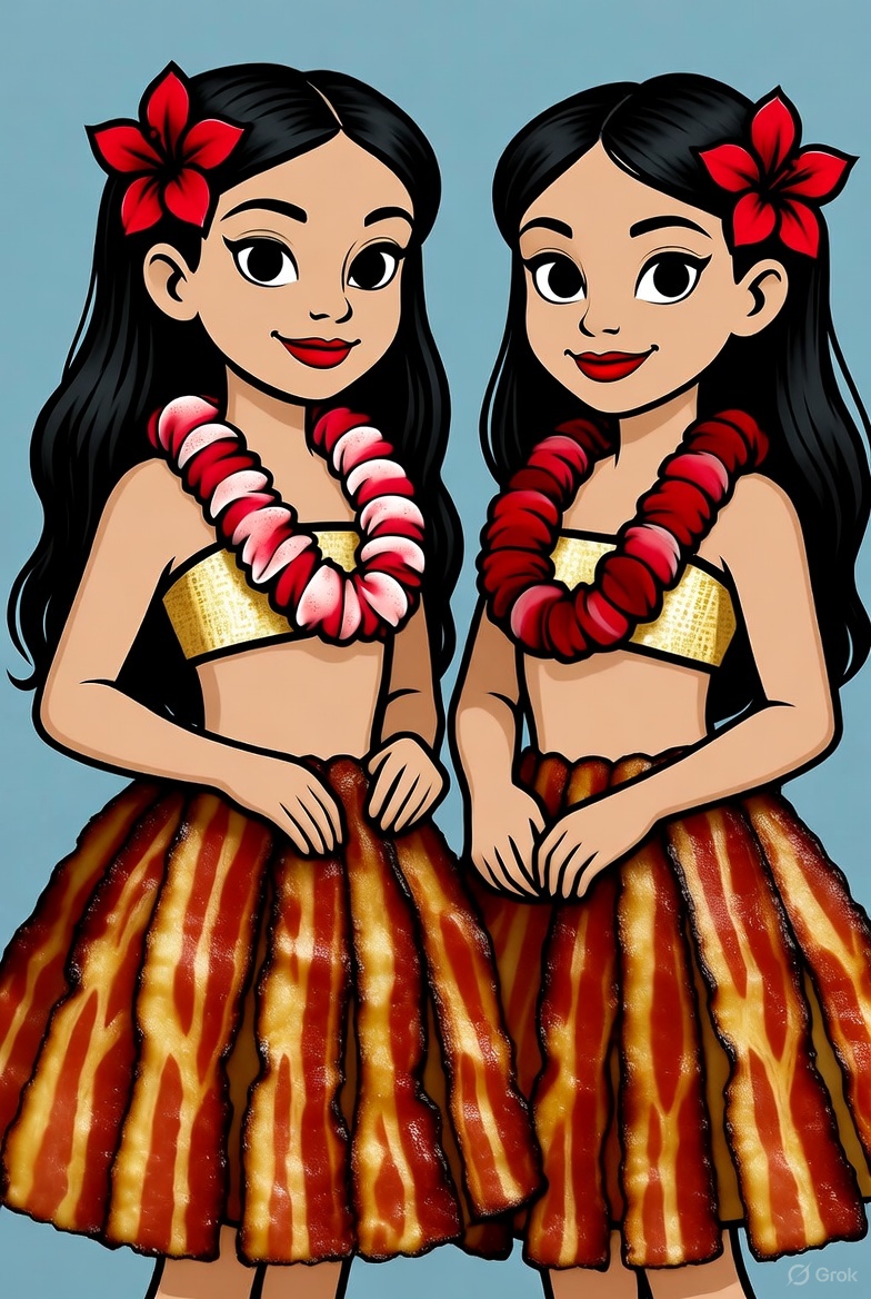 Okay, Grok drew Hawaiian hulu girls with bacon skirts. That’s all the further I can, in good conscience, request. They are cuties.