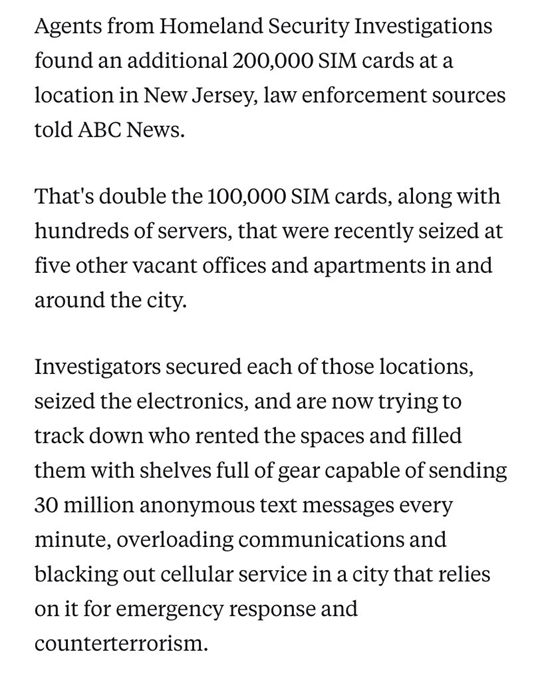 “Federal agents discovered additional locations & more equipment as they work to determine the ultimate goal of what the U.S. Secret Service said was a China-linked plot that could have crippled every cell tower in the nation's largest city, jammed 911 calls, & unleashed chaos…” pic.twitter.com/GUQ55PJheD