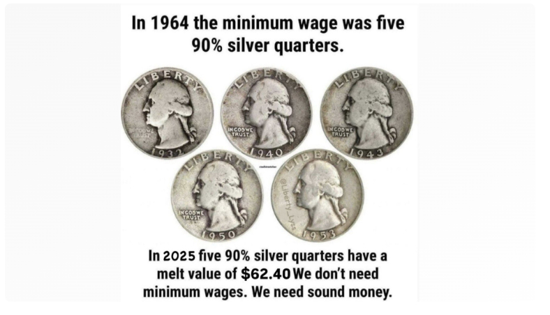 In 1964:The federal minimum wage was $1.25 per hour. That exact amount ($1.25) was five 25-cent quarters. Those quarters were made of 90% real silver worth $62.40 today.