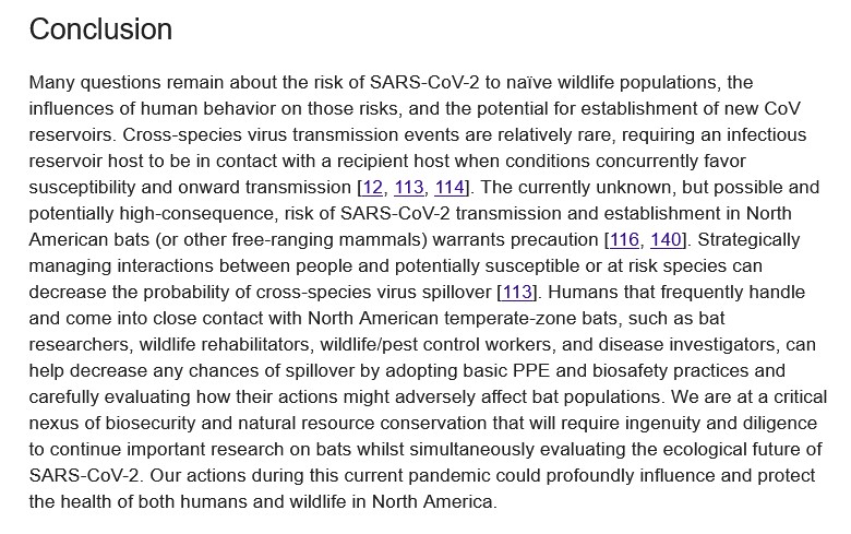 [3]: “Possibility for reverse zoonotic transmission of SARS-CoV-2 to free-ranging wildlife: A case study of bats.” Ralph S.. Baric, et al. https://doi.org/10.1371/journal.ppat.1008758. 3 September 2020.