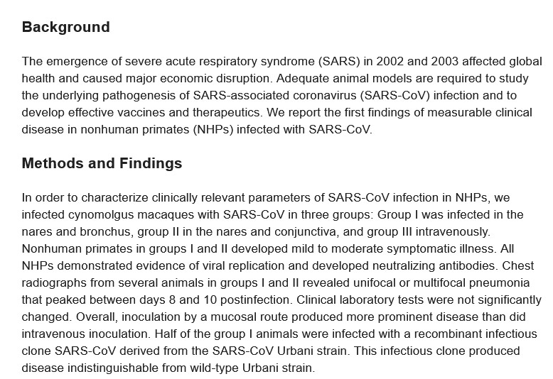The People’s Daily article mentions two papers. The first, from 2006, [8], regards the Cynomolgus Macaque as a “model” for SARS infection. Please see the screenshot from this paper, below: