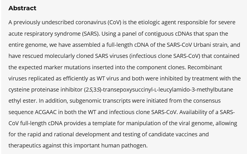 The other paper mentioned in the People’s Daily article, from 2003 [9], regards the use of reverse genetics to create a full-length cDNA SARS code (in other words, Gain-of-Function research.) Please see the Abstract from this paper, below: