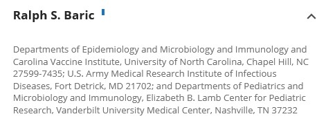 Yours Truly will note the following that are also listed in the October 2003 paper: first, the top of the Affliations list in the sidebar linked from the Authors Info & Affiliations hyperlink in the paper; and, second, the Affiliations entry regarding Dr. Ralph Baric from that list, which states that he is affiliated with USAMRIID:
