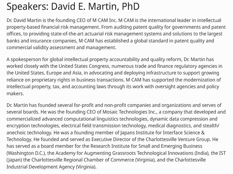 Yours Truly now turns to the work of Dr. David E. Martin, PhD. Dr. Martin is founder and CEO of M-CAM, Inc., a company that specializes in intellectual property risk management. A screenshot of a portion of his biography, from a conference in 2006 [11], is below: