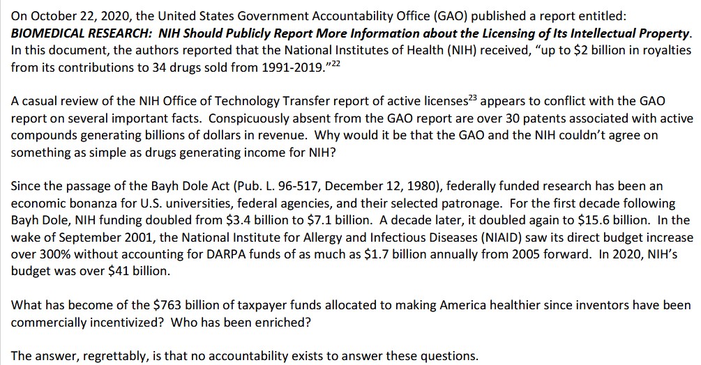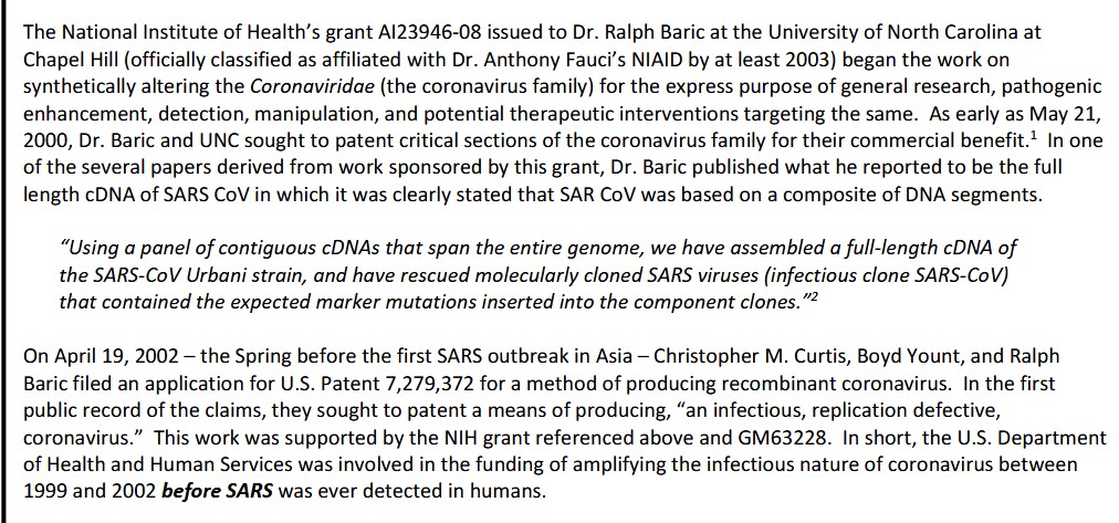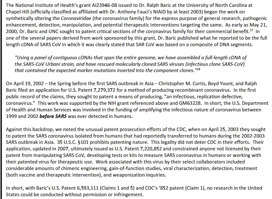 **** Yours Truly will not comment on, but simply mention, the irony that Dr. Ralph Baric, by September 2020, had already invented and Patented the SARS-CoV-2 virus (Patent Number US9884895B2, presented in Part Four of The Baric Files); that the Patent describes “methods for treatment” for an infection of this virus; and, that it appears that Emory University either did not know about said Patent, or ignored it.