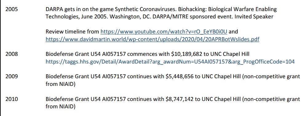 Summary: In Part Five of The Baric Files, it can be seen that the research journey of Dr. Ralph Baric, PhD, has progressed from the study of a certain mosquito that carries a certain virus (the Sindbid virus) — to the study of coronaviruses in other animals (mice and rabbits) — to the study of a certain coronavirus that occurs in pigs (the TGEV coronavirus) — to the study and application of methods to lab-create coronaviruses and the injection of such chimeric viruses into lab animals to study the effects of said injections — to the granting of Patents to Dr. Baric for this work — to the study of the SARS-line of coronaviruses — to the invention of the “template virus” for SARS-CoV-2 by Dr. Baric and the granting of the Patent to him for this invention — to Dr. Baric’s involvement with various divisions of the United States Defense Department in the lab-creation of coronaviruses. Along the way in his research journey, Dr. Baric was involved with the Dr. Zheng-li Shi of the Wuhan Institute of Virology. Along the way in his research journey, some of the funding for Dr. Baric’s work was provided by the United States Defense Department (and some of which funding was “relayed” through NIAID.)