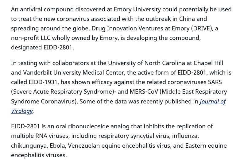 [4]: “Emory, collaborators testing antiviral drug as potential treatment for coronaviruses.” https://news.emory.edu/stories/2020/02/coronavirus_eidd/index.html. February 2020.
