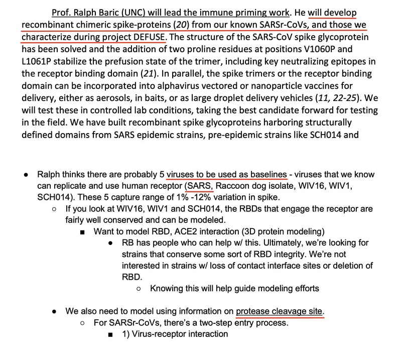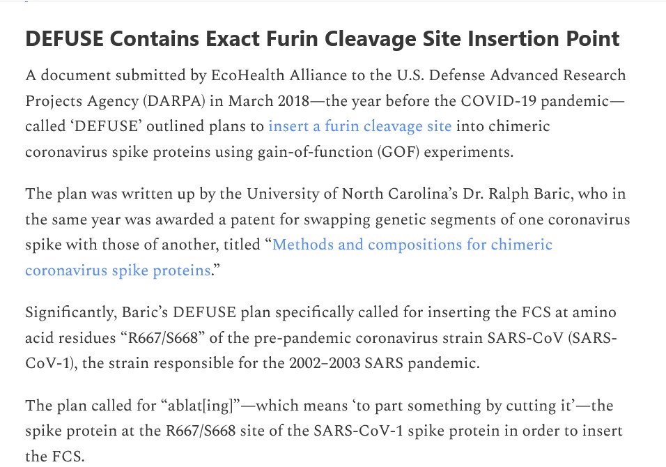 It appears that Dr. Baric has been involved with the United States Defense Department since at least 2018, if not before. The DEFUSE Proposal document that was presented to the Defense Department by Dr. Peter Daszak, then-CEO of EcoHealth Alliance, was written, in part, by Dr. Baric. Yours Truly covered this proposal in Part Four of The Baric Files (see above URL); and, is indebted to Jon Fleetwood for the linked article in today’s offering. Please see screenshots from his article [2], below: