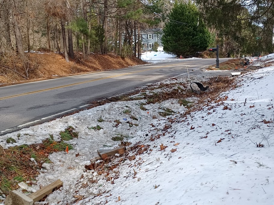 It appears that a car went out of control on the road in front of my house, careened around, and left a trail of destruction for several dozens of yards. My mailbox apparently was “Ground Zero” for the incident.