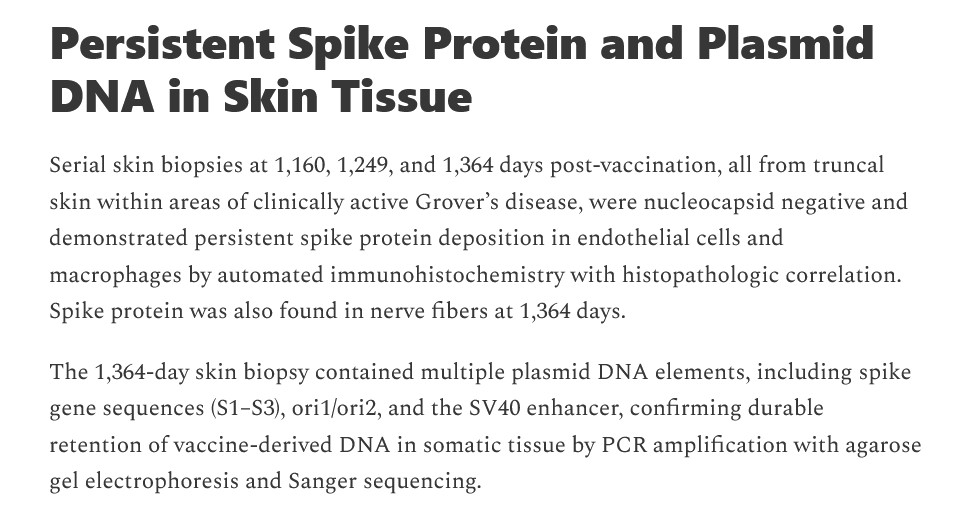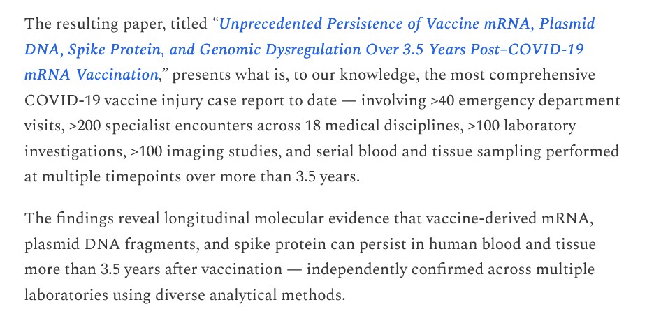 The paper, published on the Zenodo preprint server, is here: https://zenodo.org/records/18460099, “Unprecedented Persistence of Vaccine mRNA, Plasmid DNA, Spike Protein, and Genomic Dysregulation Over 3.5 Years Post-COVID-19 mRNA Vaccination”. Nicolas Hulscher, MPH, Vanessa Schmidt, PhD, Michael Morz, MD, Claire Rogers, PA-C, Natalia von Ranke, PhD, Wei Zhang, PhD, John A. Catanzano ND, PhD, Peter A. McCullough, MD, MPH. 2 February 2026. Yours Truly urges interested readers to download or otherwise archive this paper — it is a prime target to be Retracted / Removed / Withdrawn, due to pressure on the publisher by Pfizer-BioNTech (PfizerUSA) and/or other Big Pharma or Big Government entities.