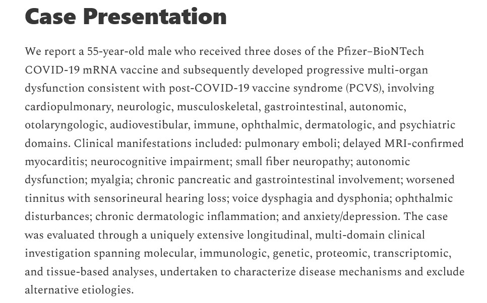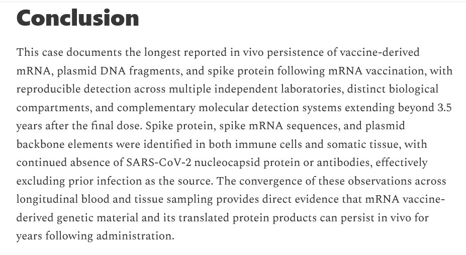 The Focal Points story on the paper is here: https://www.thefocalpoints.com/p/breaking-vaccine-mrna-plasmid-dna, “BREAKING: Vaccine mRNA, Plasmid DNA, and Spike Protein Can Persist in Humans More Than 3.5 Years After COVID-19 Vaccination”, Nicolas Hulscher, MPH, 2 February 2026. Mr. Hulscher is one of the co-authors of this paper. Please see the screenshots from this article, below, from the summary of the paper; from the Case Presentation; from the discussion section; and, from the Conclusion:
