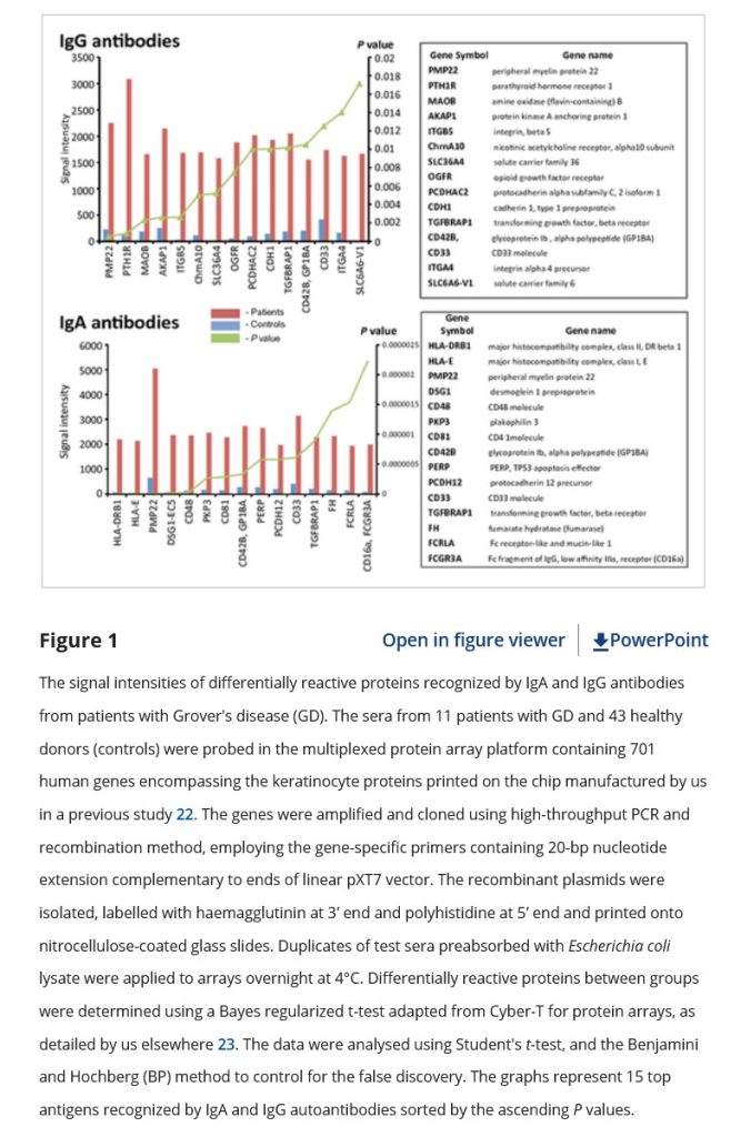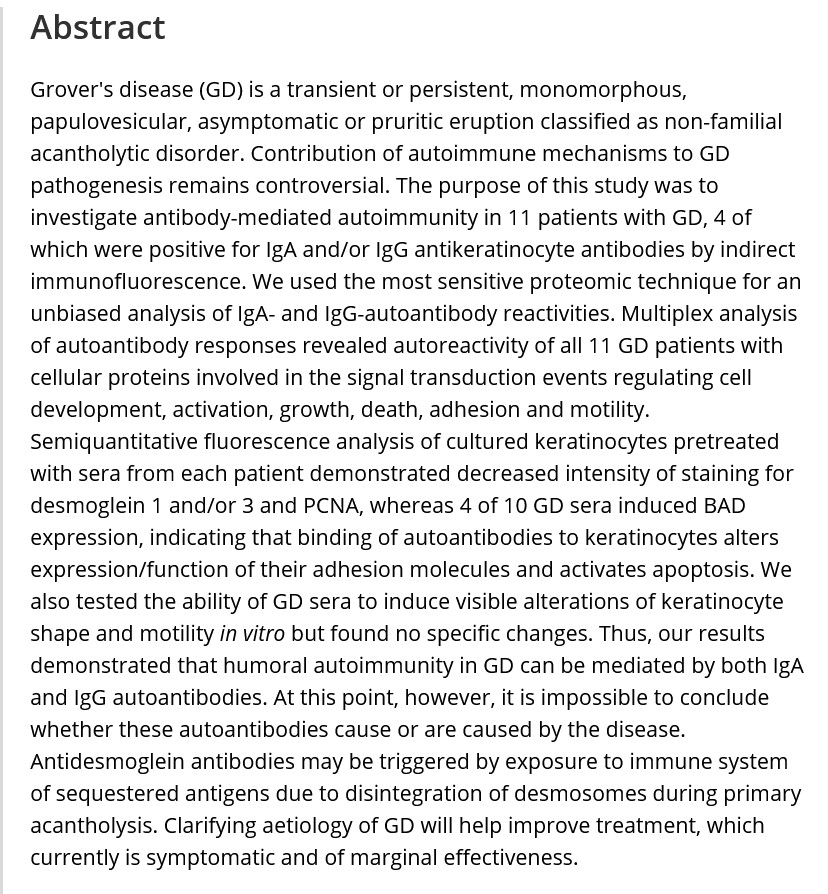 **** However, there is another viewpoint regarding what may cause, or at least be involved in, Grover’s Disease: dysfunction of the IgA and IgG immune system cells of the patient’s body. Phillips, et al. describes this issue, here: https://doi.org/10.1111/exd.12266, “Is Grover’s disease an autoimmune dermatosis?”, Courtney Phillips, et al. 22 December 2013. Please the screenshots of the Abstract and of the Figure 1. from this paper, below: