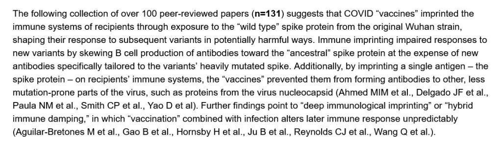 In Yours Truly’s opinion, at least part of the situation regarding Grover’s disease as a negative outcome from modRNA COVID-19 “vaccination” is that these injectables “imprint” on the body’s natural immune system — and, in multiple negative ways. Please see: https://www.thefocalpoints.com/p/immense-covid-19-vaccine-antigenic, “Immense COVID-19 ‘Vaccine’ Antigenic Sin Research Library Published”, Nicolas Hulscher, MPH, 13 January 2025. The paper referred to in the Hulscher article is here: https://zenodo.org/records/14632346 “COVID “vaccines” immune imprinting library.” Erik Sass, et al. 11 January 2025. Please see the screenshot from the opening statement of this paper, below: