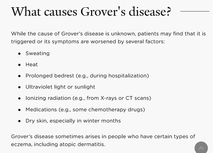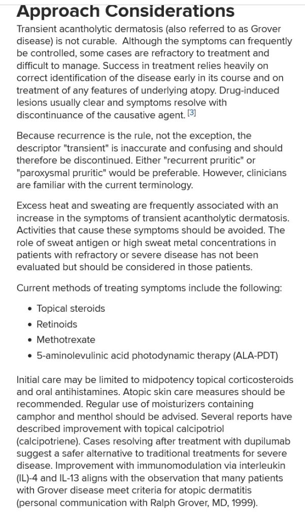 Please see the screenshot, below, from https://www.pcds.org.uk/clinical-guidance/grovers-disease-syn-transient-acantholytic-dermatosis1, “Grover’s disease (syn. transient acantholytic dermatosis”, The Primary Care Dermatology Society (UK; copyright 1994-2026):
