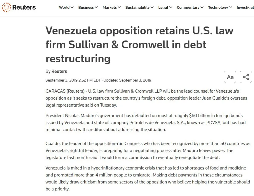 I recently learned that the Venezuelan opposition, operating out of the United States and led by Juan Guaido, among others, retained the law firm Sullivan & Cromwell back in 2019 to prepare to restructure the $60 billion in debt that Venezuela had