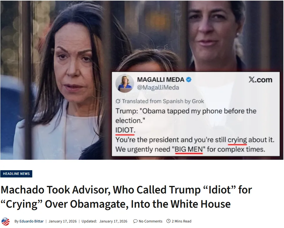 We are also learning that Machado brought with her to the White House an advisor who once publicly called President Trump, “an idiot,” for accusing former US President Barack Obama of spying on him.
