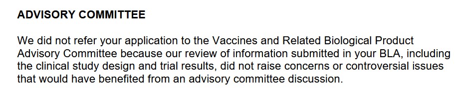 It appears that Dr. Kaslow relied solely on the “data” that was given to the FDA by Moderna regarding the “safety and efficacy” of mRNA-1283, prior to that agency’s granting approval of the BLA (Biologics License Application) that Moderna submitted for the product. In addition, it appears that Dr. Kaslow believed that the “data” that Moderna supplied to the FDA was sufficient enough to warrant a bypass of the review process by the VRBPAC group of the FDA (Vaccines and Related Biological Products Committee.) Please see the screenshot from Dr. Kaslow’s Approval Letter to Moderna for mRNA-1283 (mNEXSPIKE), below:
