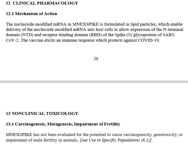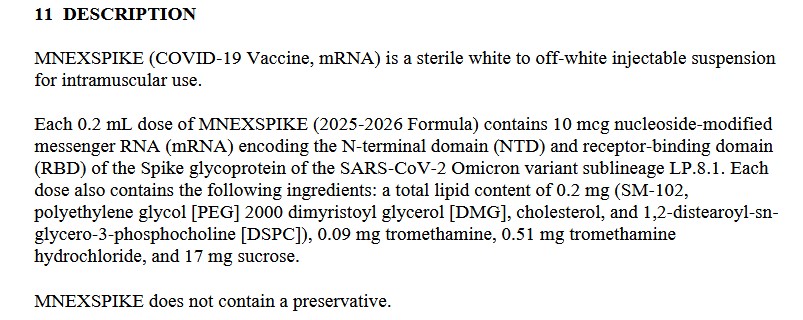 The Package Insert for healthcare professionals for mRNA-1283 (mNEXSPIKE) is here: https://www.fda.gov/media/186738/download. Please see the screenshots of the following sections of this Package Insert, below: first, section 11 Description; then, section 12 Clinical Pharmacology, and section 13 Nonclinical Toxicology: