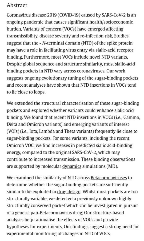 The issue regarding developing a modRNA COVID-19 bioweapon “vaccine” that only utilizes the N-terminal domain and the receptor-binding domain appears to have been determining exactly what “binding pocket” of the N-terminal domain would work. Scientists had been experimenting with the N-terminal domain to find such a “binding pocket”: for example, as described in this paper, from 2022: https://doi.org/10.1016/j.csbj.2022.11.004. “Structural and energetic analyses of SARS-CoV-2 N-terminal domain characterise sugar binding pockets and suggest putative impacts of variants on COVID-19 transmission.” Jonathan Lees, et al. 17 November 2022. Please see the screenshots from this paper, below; first, the Abstract; followed by the Graphical Abstract: