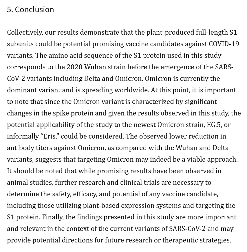 Note that Mamedov, et al., used a tobacco plant to produce the S1 protein from SARS-CoV-2, which they then tested against Delta and Omicron virus variants.