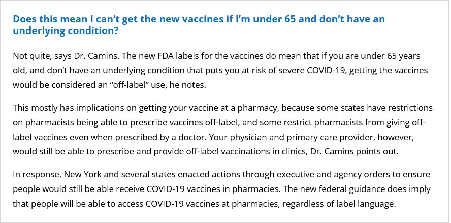However, regarding mNEXSPIKE, there apparently is a “blurred line” as to the use of it in persons under age 65 who do not have an “underlying medical condition.” Please see the screenshot below, from this article: https://health.mountsinai.org/blog/heres-what-you-need-to-know-about-the-new-covid-19-vaccines/, 23 September 2025; the advice is from Dr. Bernard Camins, MD, MSc, of Mount Sinai Hospital, in the “FAQ” section: