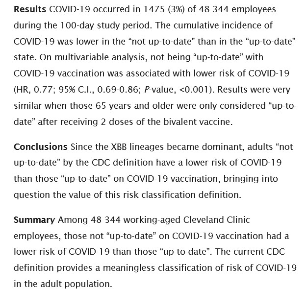 The “prevent coronavirus disease 2019 (COVID-19)” statement is still being used by the FDA on COVID-19 bioweapon “vaccines” Package Inserts, despite the fact that Shrestha, et al., demonstrated in 2023 that “fully up-to-date vaccinated” Cleveland Clinic employees were more likely to become COVID-19 infected than those who were not “fully up-to-date” with COVID-19 “vaccination” (https://doi.org/10.1101/2023.06.09.23290893. “Risk of Coronavirus Disease (COVID-19) Among Those Up-to-Date and Not Up-to-Date on COVID-19 Vaccination.” Nabin K. Shrestha, et al. 13 June 2023.) Please the screenshot from this paper, below: