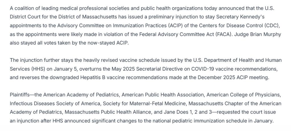 The ruling by Judge Murphy is here: https://fingfx.thomsonreuters.com/gfx/legaldocs/gdpzawegkvw/03162026vaccine.pdf. The list of plaintiffs, and more coverage of the Murphy ruling, are here: https://www.apha.org/news-and-media/news-releases/apha-news-releases/federal-judge-blocks-immunization-schedule-changes, “Federal Judge Blocks Immunization Schedule Changes, Stays ACIP Member Appointments”, 16 March 2026. Please see the screenshot, below, from this article: