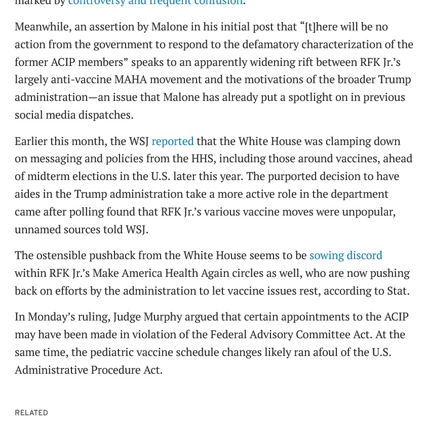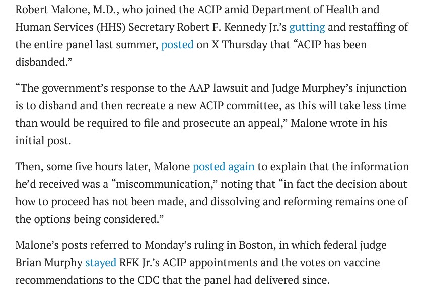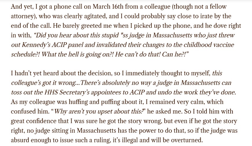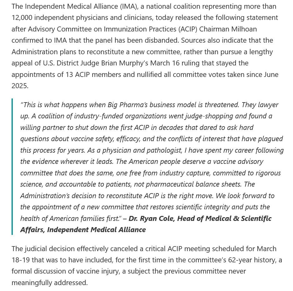 If, as Attorney Cox states, the Murphy “ruling” can be overturned in court, why did HHS apparently choose NOT to fight the “ruling”, opting instead to “reconstitute” the ACIP group? Please see: https://imahealth.substack.com/cp/191534018, “Breaking News: Chairman Milhoan Confirms that ACIP Disbanded in Response to Federal Court Ruling: Sources Indicate Administration Opts to Reconstitute ACIP Rather Than Appeal”, 16 March 2026. A screenshot from this article is below: