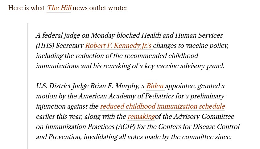 What the situation is today: Big Pharma, the American Academy of Pediatrics, and the Federal Judiciary, are in control of the Department of Health and Human Services. What the situation is today: HHS has opted to “reconstitute” the ACIP group, instead of fighting the Murphy “ruling” in court — in effect, acquiescing to the “ruling.” This acquiescing “kicks the door off the hinges” for any Federal Judge to stop / stay / delay, any directive, recommendation, committee, or activity of that committee, of the HHS, CDC, or FDA.