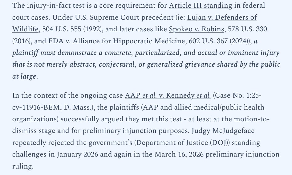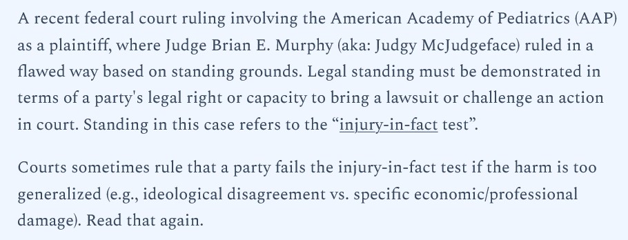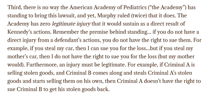 Regarding the last point, about the American Academy of Pediatrics (AAP) having no standing: Guess what? The AAP gets large donations from Big Pharma entities, such as, Pfizer, Moderna, and, Seqirus. The AAP is completely compromised and should never have been a party to this (bogus) lawsuit in the first place. Please see: https://www.aap.org/en/ways-to-give/current-corporate-and-organizational-supporters/, from 10 October 2025: