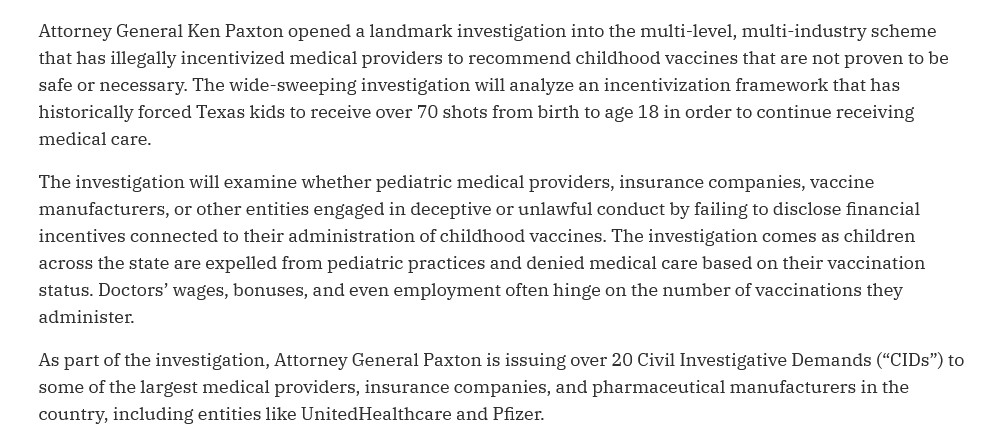 In addition, pediatricians receive “financial incentives” from Big Pharma companies and from insurance companies via programs to ensure that children are “vaccinated.” This, despite the denials and “fact-checking” by media and by organizations such as the AAP about such “incentive payments.” In fact, Texas Attorney General Ken Paxton has initiated an investigation into these payments given to pediatricians in his state. Please see: https://www.texasattorneygeneral.gov/news/releases/attorney-general-ken-paxton-launches-wide-sweeping-investigation-unlawful-financial-incentives, “Attorney General Ken Paxton Launches Wide-Sweeping Investigation into Unlawful Financial Incentives Related to Childhood Vaccine Recommendations”, 21 January 2026. Please see the screenshot, below, from this article: