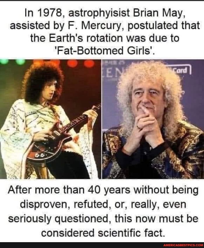 I was looking for one from right after he got his PhD in astrophysics, which said something like, “Newly minted astrophysics PhD Sir Brian May discusses (with amateur observer F. Mercury) his finding that young females with sufficient adipose tissue and a low center of gravity maintain terrestrial angular velocity.”