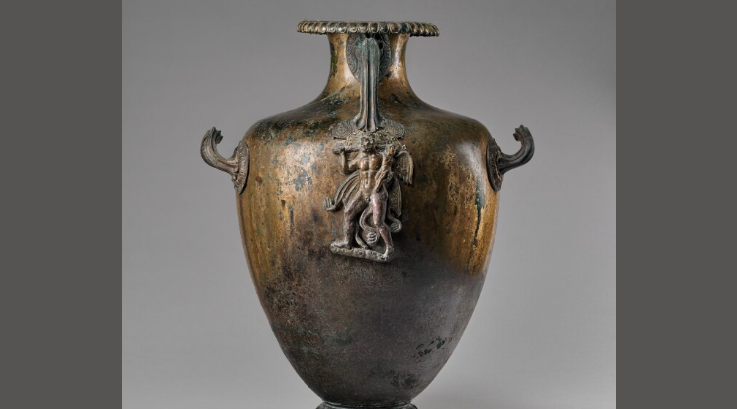 The kalpis is a variant form of the more common hydria, a vessel used for carrying water. Often awarded as prizes in competitions and dedicated in sanctuaries, these valuable objects also served as cinerary urns and ballot boxes. Decorative appliqués or statuettes were usually cast separately and soldered or riveted to the exterior.