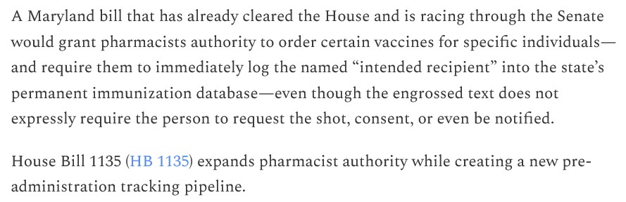 In Maryland, if a newly-proposed law there comes into effect, pharmacists will be able to order certain “vaccines” for patients; while, at the same time, placing the names of those persons into the Maryland state database for immunization tracking: https://jonfleetwood.substack.com/p/maryland-bill-lets-pharmacists-order, “Maryland Bill Lets Pharmacists Order Vaccines for You — Logging Your Name in State Tracking System Without Any Patient-Request Requirement”, 3 April 2026. A screenshot from this article is below: