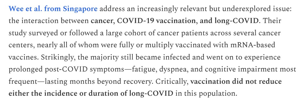 Dr. Peter A. McCullough addresses the nexus among cancer patients who then get COVID-19 “vaccinated” and thereupon afterwards present with symptoms of Long COVID: https://www.thefocalpoints.com/p/the-hollow-promise-of-protection, 7 April 2026. A screenshot from this article is below (access to the entire particle is for subscribers only):