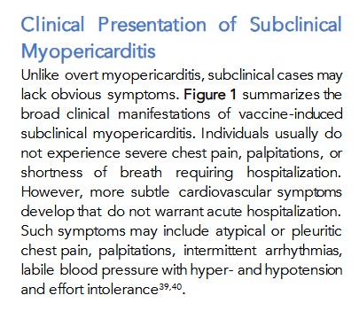 A related topic to the heart issues situation found in the military personnel at the air transportation base in Prague who had been COVID-19 “vaccinated”: This one regards subclinical myocarditis/pericarditis in COVID-19 “vaccinated” persons: https://www.thefocalpoints.com/p/breaking-peer-reviewed-paper-finds, “BREAKING: Peer-Reviewed Paper Finds mRNA “Vaccines” Convey Silent Heart Damage—Presents Approach to Diagnosis and Management”, Nicolas Hulscher, MPH, 31 December 2025. A screenshot from this paper is below: