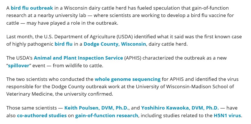 Let’s look at a recent example of “Gain-of-Function Experiments Gone Wrong”: https://childrenshealthdefense.org/defender/exclusive-bird-flu-outbreak-40-miles-wisconsin-lab-sparks-concern-gain-of-function-experiments/, “Exclusive: Bird Flu Outbreak 40 Miles From Wisconsin Lab Sparks Concern About Gain-of-Function Experiments”, Michael Devradakis, PhD, 15 January 2026. A screenshot from this article is below: