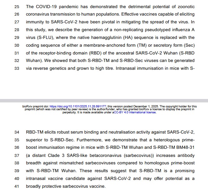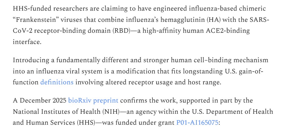 Yours Truly begins here: https://jonfleetwood.substack.com/p/hhs-funds-gain-of-function-influenzacovid, “HHS Funds Gain-of-Function Influenza — COVID ‘Frankenvirus’ Combining Influenza Entry With SARS-CoV-2 Human Cell – Binding Domain”, 10 April 2026. Two screenshots regarding this are below: the first, from the Fleetwood article; the second, from the paper itself (published December 2025). Thanks to Mr. Fleetwood for this information: