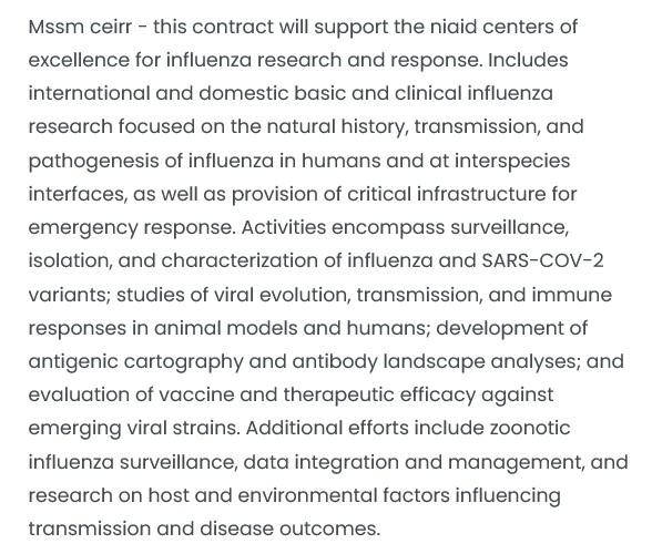Note that sentence about, “Includes international and domestic basic and clinical influenza research…” — in other words, covering “collaborators” like CAMS. Note that “studies of viral evolution, transmission, and immune responses in animal models and humans” covers Gain-of-Function work.