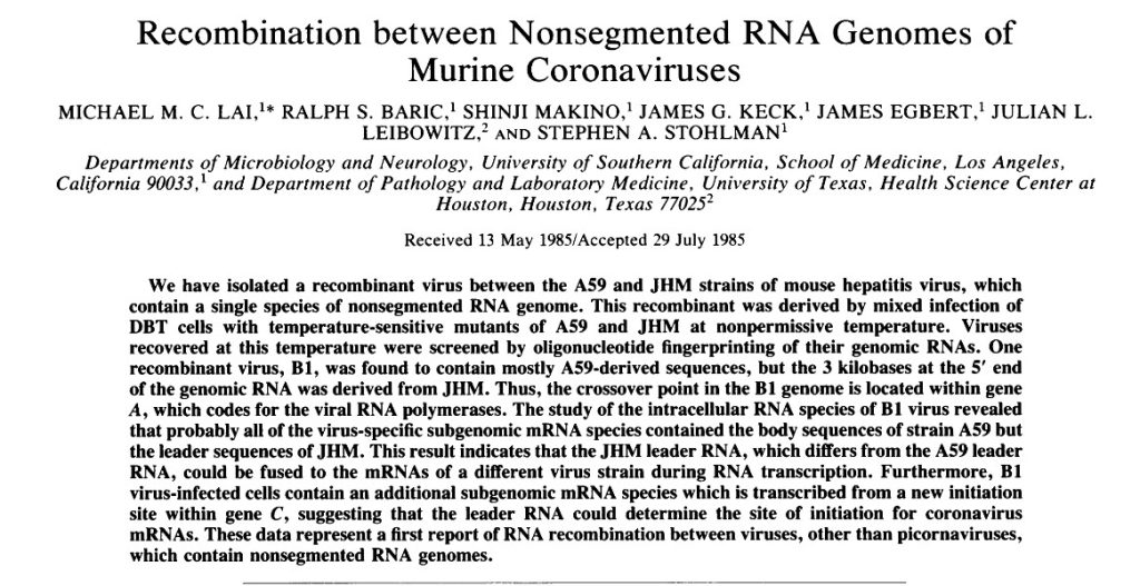 [2]: “Recombination between non-segmented RNA genomes of murine coronaviruses.” Lai, M.M.C., Baric, R.S., Makino, S., Keck, J.G., Egbert, G.E., Leibowitz, J., Stohlman, S.A. https://pmc.ncbi.nlm.nih.gov/articles/PMC252599/pdf/jvirol00116-0117.pdf. 1986.