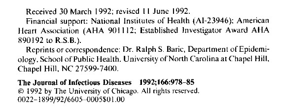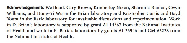 There is one more screenshot from this 1990 paper, which Yours Truly considers to be a significant publication in the research journey of Dr. Baric: the Acknowledgements section: