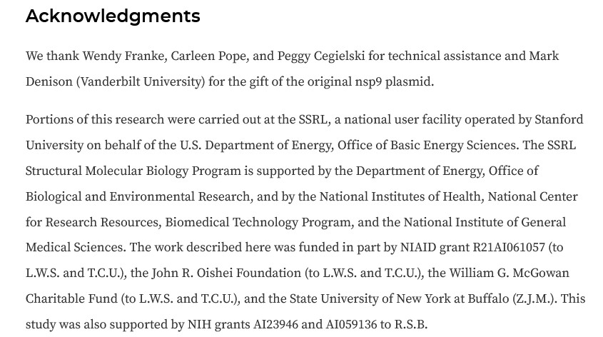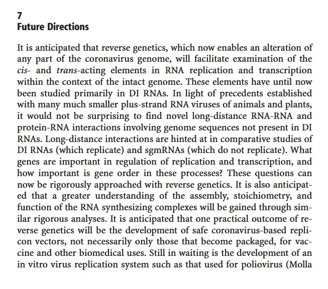 Yours Truly decided to investigate more regarding the NIH grant award AI 23946 to Dr. Baric. Two more (of the multiple papers) funded by this grant are: one, for example, from 2005: “Coronavirus Genome Structure and Replication” [6]. Please see the screenshots, below, from this paper: the Title and Authors page; the Future Directions section; and, the Acknowledgements:
